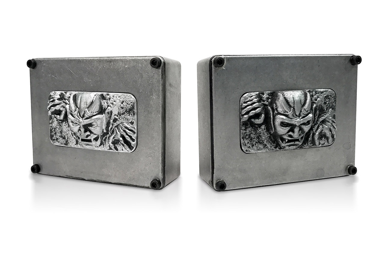 The outer package was a custom aluminum box with a cast replica of the “demon head” protruding from atop the actual car’s supercharger. Four guide bolts connected the lid to the box bottom, and a numbered identification plate (sequence 0001 to 1121) was affixed to the inside of the lid.