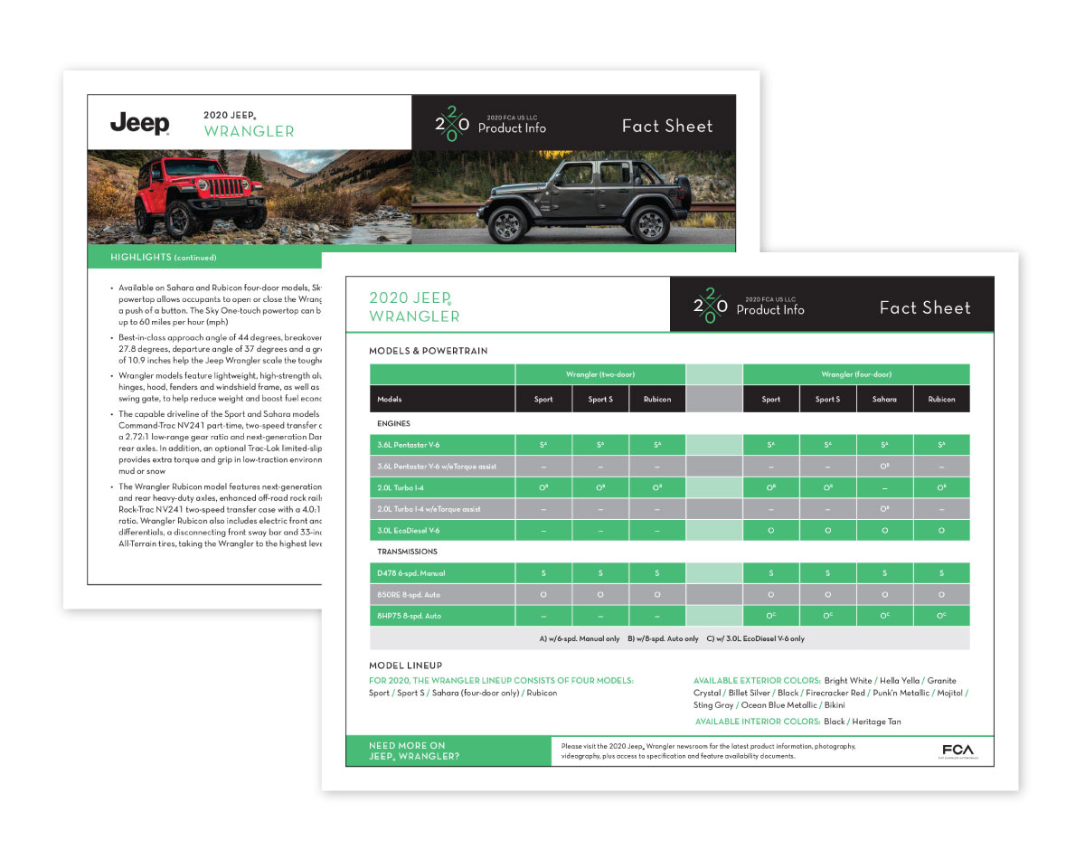 FCA’s 2019 full-line product kit provides in-depth media information on all brands and vehicles, and includes sections on safety, technology and corporate, as well as high-resolution photography and video. A web key, providing access to an interactive site, was given to media at a full-line event held prior to the new model year product launch. The site is updated on an ongoing basis as product revisions occur during pre-production, and the kit/web key is distributed at other media events during the year.